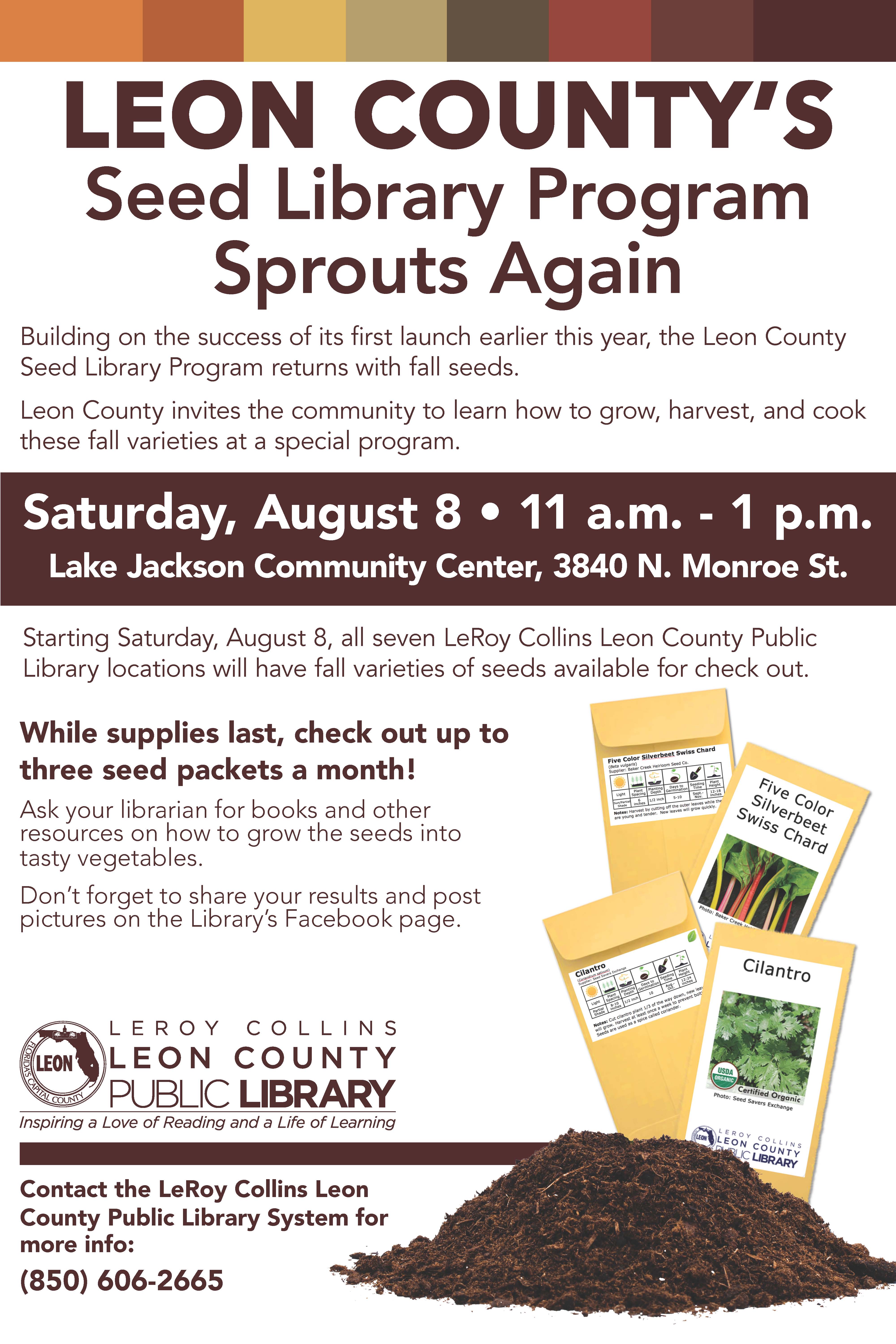 But, patrons do not need to attend the event to check out seeds. In fact, all seven LeRoy Collins Leon County Public Library locations are participating in the Leon County Seed Program, which will offer fall varieties of seeds for the current planting season. Seeds will be available for check out at all library locations beginning Saturday, August 8, while supplies last.