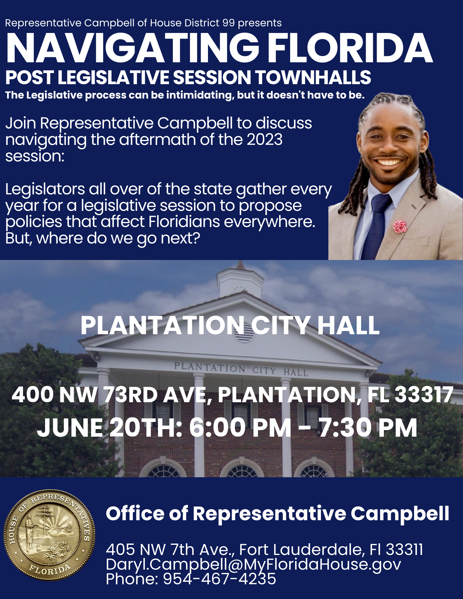 June 20 - State Rep. Daryl Campbell will lead a Town Hall at 6 p.m. at Plantation City Hall. Representative Campbell and State Sen. Rosalind Osgood combined for a state legislative update recently at the African-American Research Library.