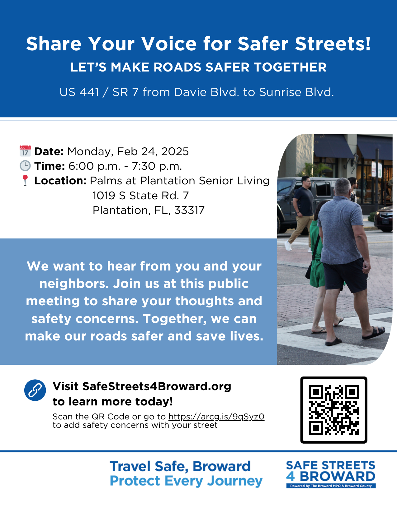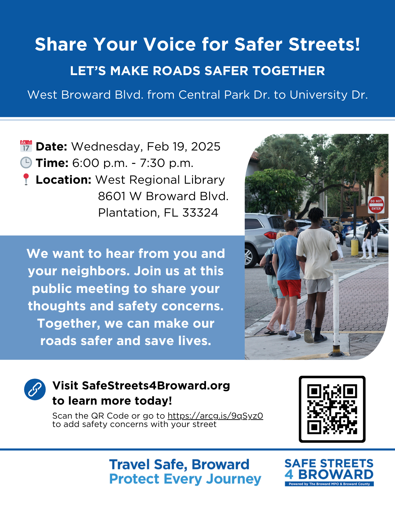 To that end, the program proposes 23 “countermeasures” to make a roadway safer, ranging from speed limit reductions to raised crosswalks to lighting upgrades. Meetings to discuss options are scheduled at 6 p.m. Feb. 19 at West Regional Library and at 6 p.m. Feb. 24 at the Palms at Plantation Senior Living Community.