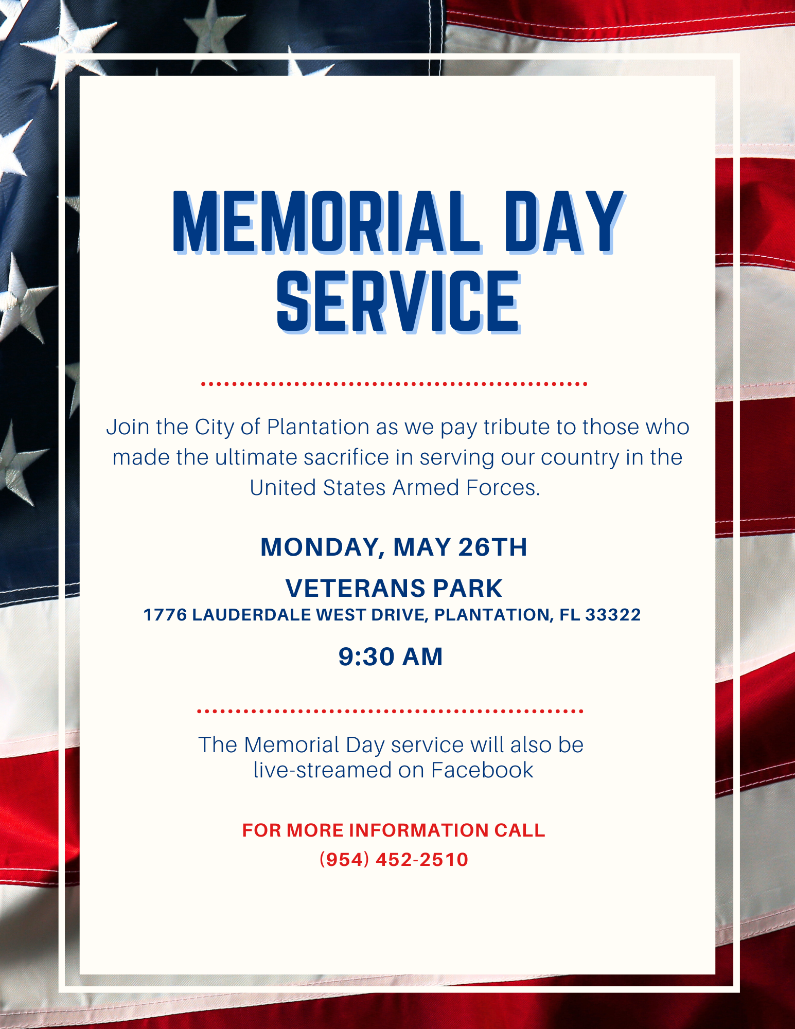 May 26: Memorial Day Service at 9:30 a.m. at Veterans Park. Join us as we pay tribute to those who made the ultimate sacrifice in serving our country in the United States Armed Forces.