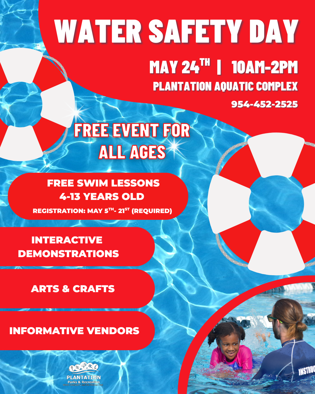 Saturday, May 24, is “Water Safety Day” from 10 a.m. to 2 p.m. at the Plantation Central Park Aquatic Complex.