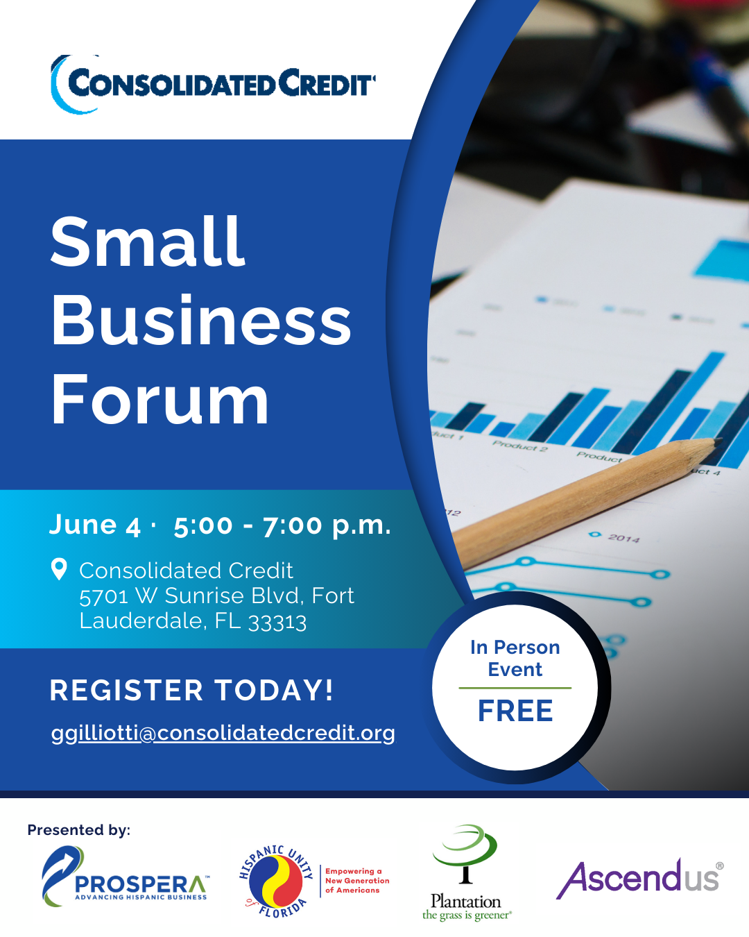 Join us at our upcoming Small Business Forum on June 4 from 5 p.m. to 7 p.m. at Consolidated Credit (5701 W. Sunrise Blvd.), for an exclusive opportunity to elevate your business to the next level. Discover vital financial resources tailored for growth, actionable strategies to expand your operations, and expert insights on improving your business credit score. Plus, gain access to innovative marketing and promotional tools designed to boost your visibility and success.