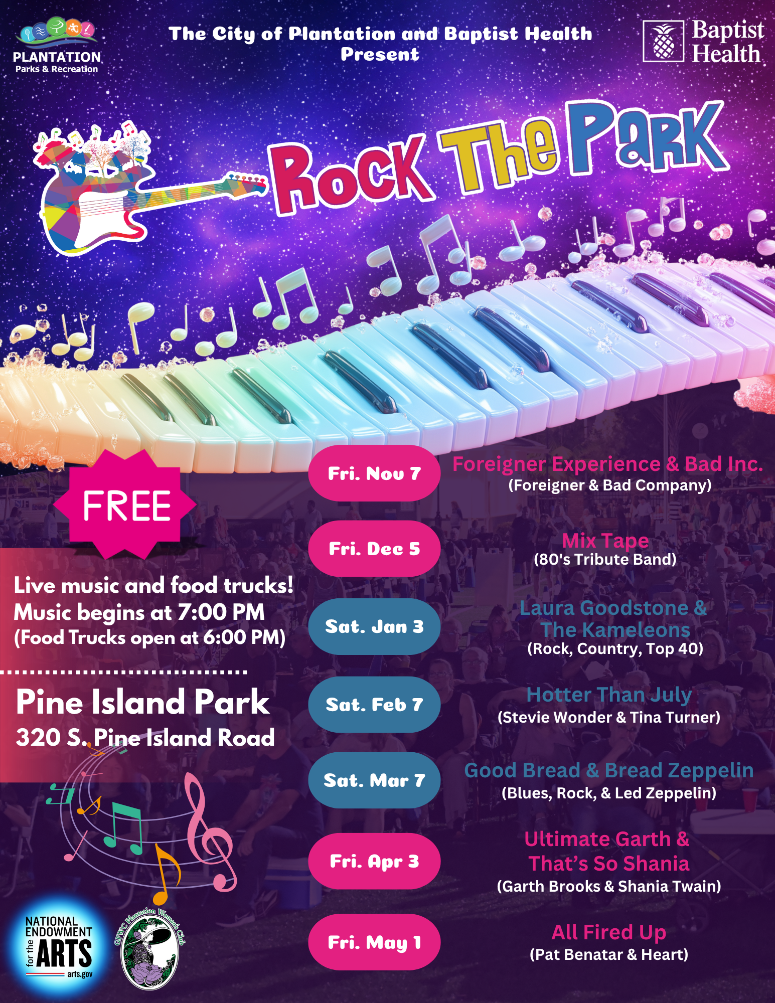 The first concert in our popular Rock the Park series kicks off at 7 p.m. on Friday, Nov. 7, at Pine Island Park. The bands performing are Foreigner Experience and Bad Inc., which will play songs by Foreigner and Bad Company.