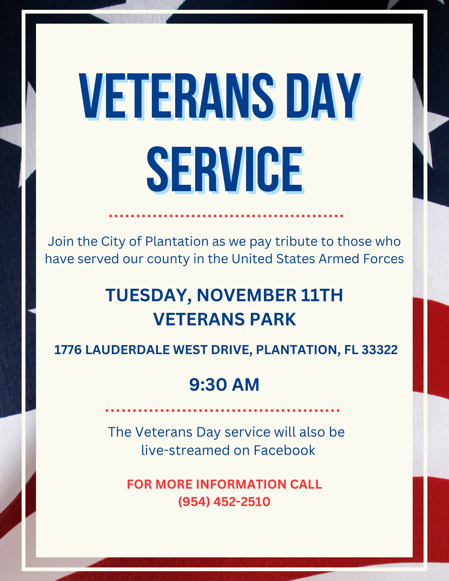 Our Veteran’s Day ceremony is at 9:30 a.m. Tuesday, Nov. 11, at Veterans Park, 1776 Lauderdale West Drive. The ceremony will be live-streamed on Facebook.