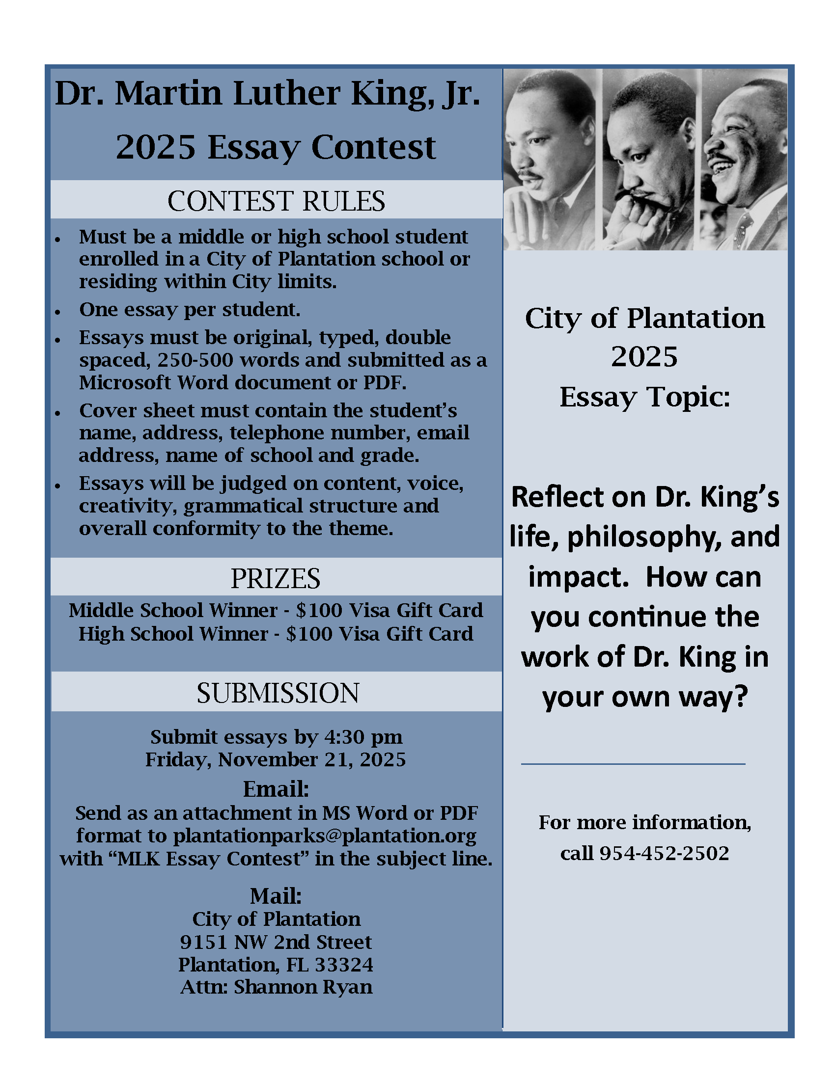 November 21: Dr. Martin Luther King Jr. essays are due for the contest. Winners of each group will receive a $100 Visa Gift Card. For more information please call (954) 452-2510.