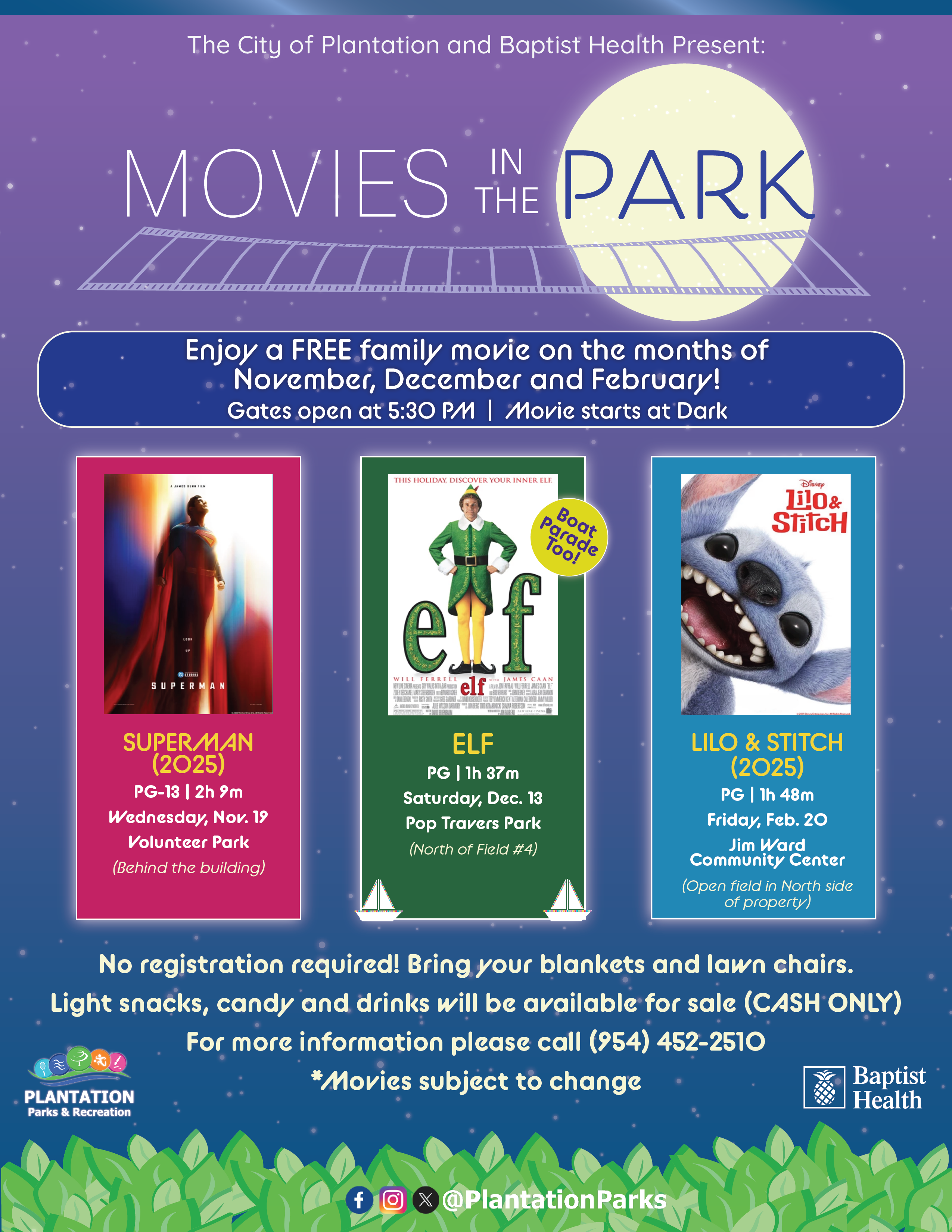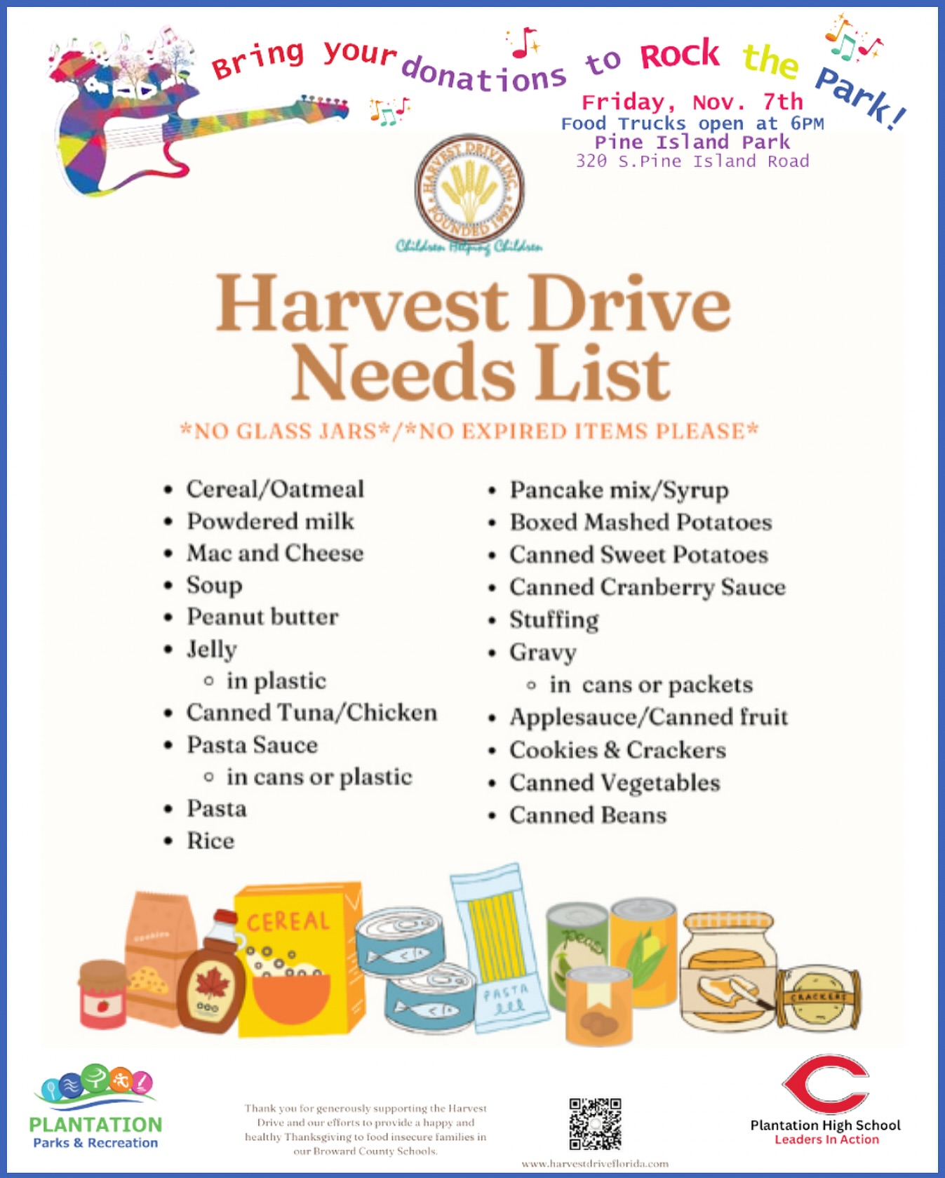 To support local families facing hardship, Councilmember Denise Horland is leading a partnership with Plantation High School to collect non-perishable food items for Harvest Drive during the concert. Your generous support will help provide daily food assistance as well as a joyful and healthy Thanksgiving for food-insecure families in Broward County Public Schools. Drop-off bins will be available at the event entrance.