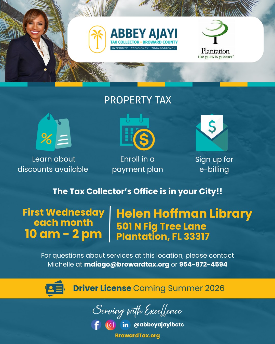 February 4: Broward County Tax Collectors office staff members will be at the Helen B. Hoffman Plantation Library from 10 a.m. to 2 p.m. to assist residents with their property tax questions and resources.