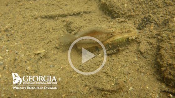 Not convinced? Watch the video above. What you'll see is a finelined pocketbook mussel in northwest Georgia’s Holly Creek using the fleshy tissue in its shell to mimic a wounded fish. Likely a blackbanded darter – bands, eye spots and all.