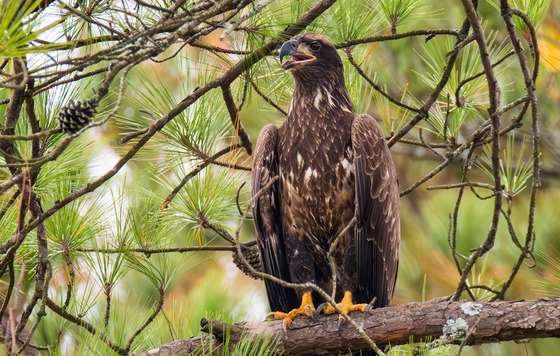 One of this year's juvenile bald eagles -- note the large beak and yellow feet -- in north Georgia (Ron Goldfarb)