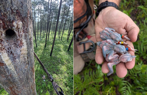 The view from a nest cavity, left, and three red-cockaded woodpecker nestlings after banding (Joe Burnam/DNR)