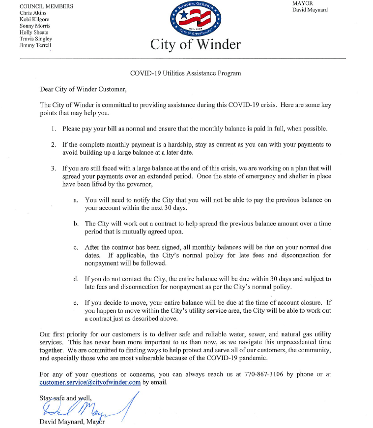City of Winder, GA sent this bulletin at 04/27/2020 09:35 AM EDTThe City of Winder is committed to providing assistance during this COVID-19 crisis. Here are some key points that may help you.