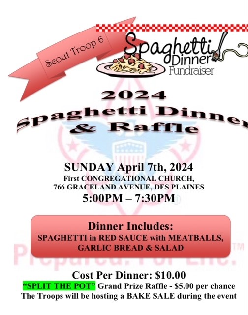 BSA Troop 6 located at 1st Congregational Church in Des Plaines is having their annual spaghetti dinner on April 7th from 5-7:30. Please see the attached flyer for details