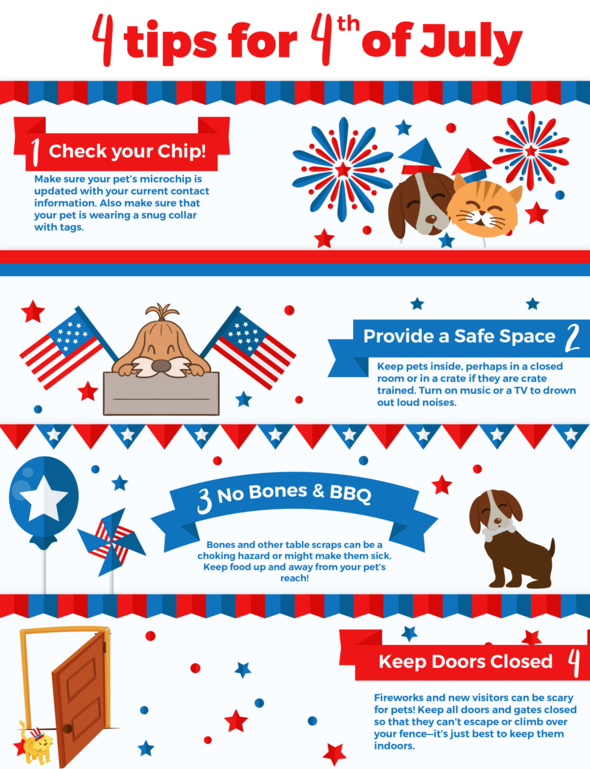 The Fourth of July celebrations can be stressful for our pets - let's keep them safe with a few easy to follow tips. Click the graphic to get more information from the American Veterinary Medical Association.