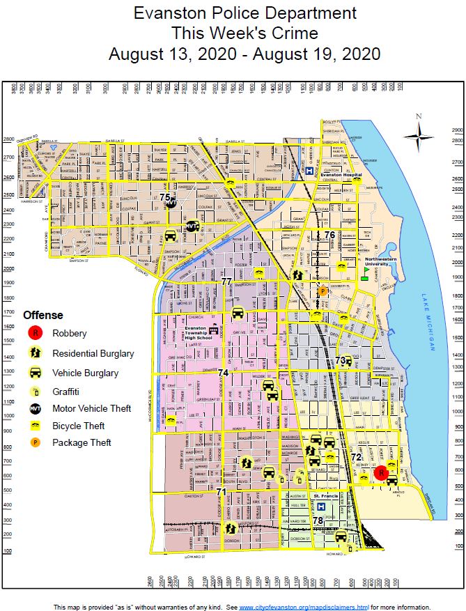 - The week’s 9 motor vehicle burglaries took place mostly on the south end of Evanston. Every one of these vehicles was unlocked. Either nothing was reported missing or pocket change was taken; however, in two cases, purses, wallets and backpacks were removed.