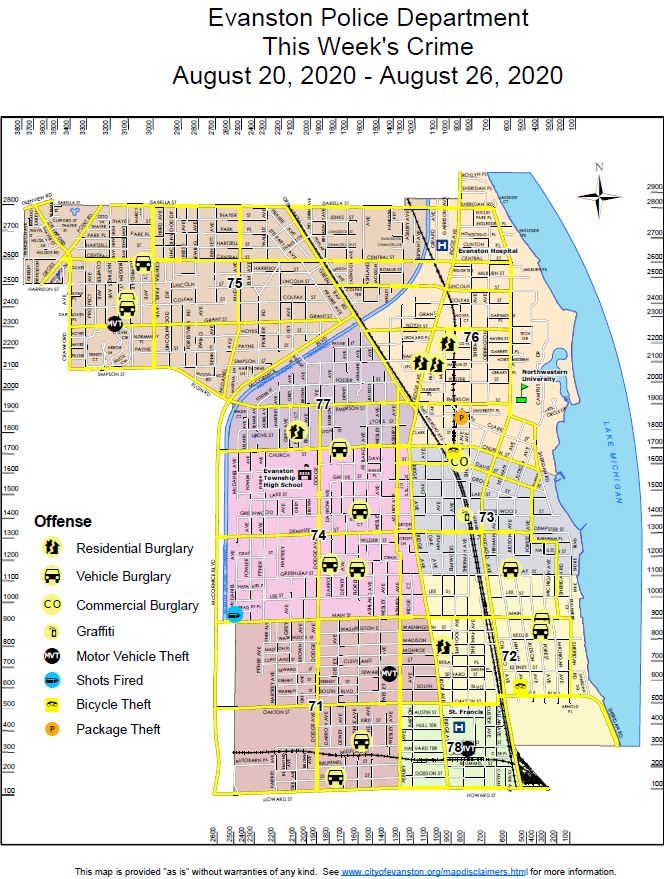- There were five residential burglaries between 8/13 and 8/22, three of them in Beat 76 (northeastern Evanston). Crooks entered through unlocked doors and windows.
