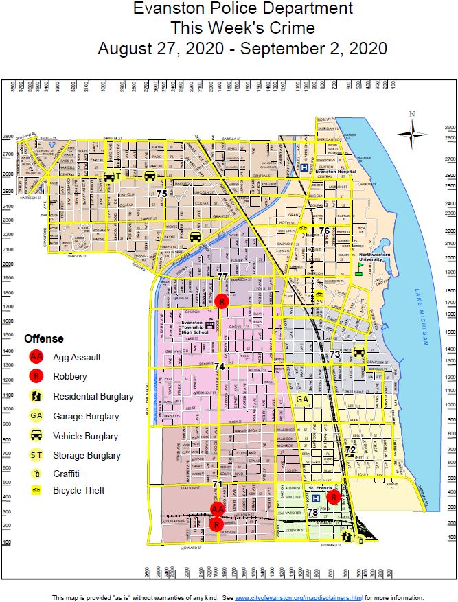 - Two residential break-ins were reported to the police. On 8/28, burglars kicked in a door at a residence in the 100 block of Clyde. On 8/26, crooks entered an apartment in the 700 block of Hinman through an unlocked door. Cash was reported stolen at both locations.