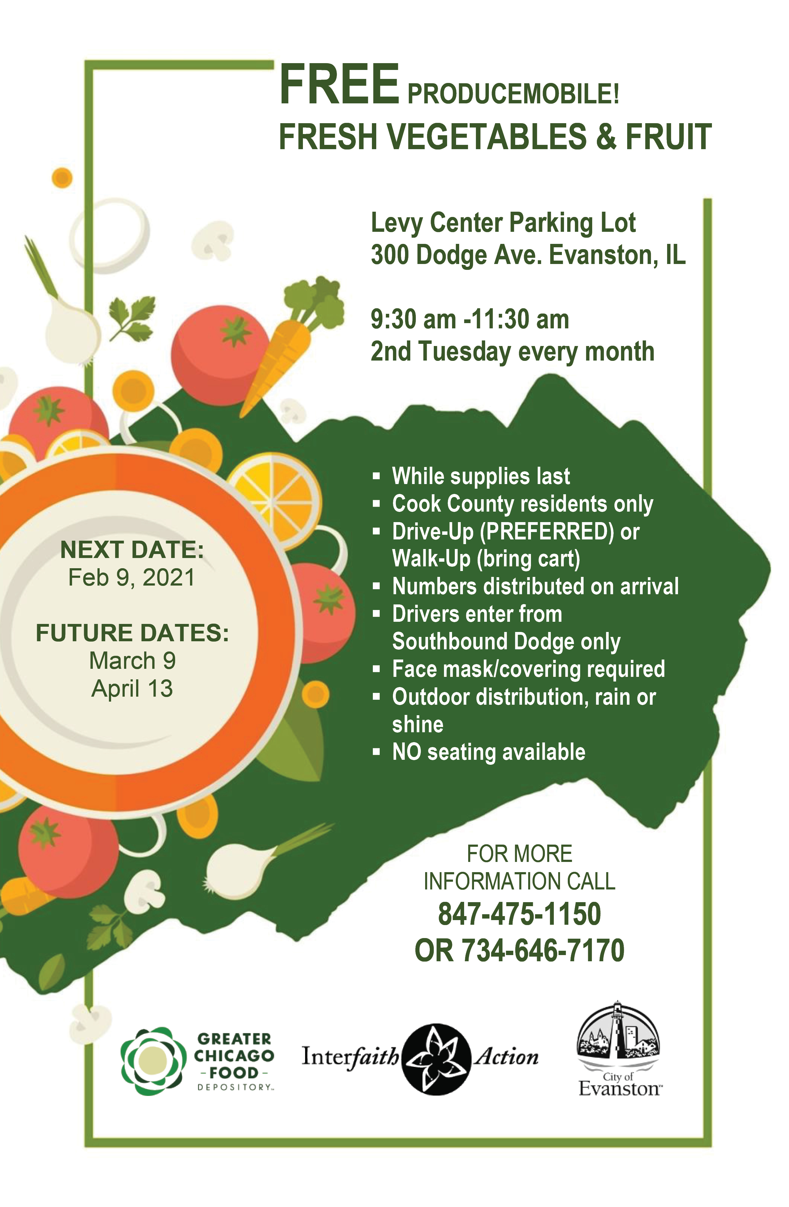 Residents can pick up boxes of fresh produce at the Greater Chicago Food Depository's Producemobile, scheduled to visit the Levy Senior Center parking lot, 300 Dodge Ave., from 9:30 a.m. to 11:30 a.m. on Tues., Feb. 9. Call 847-475-1150 for more information.