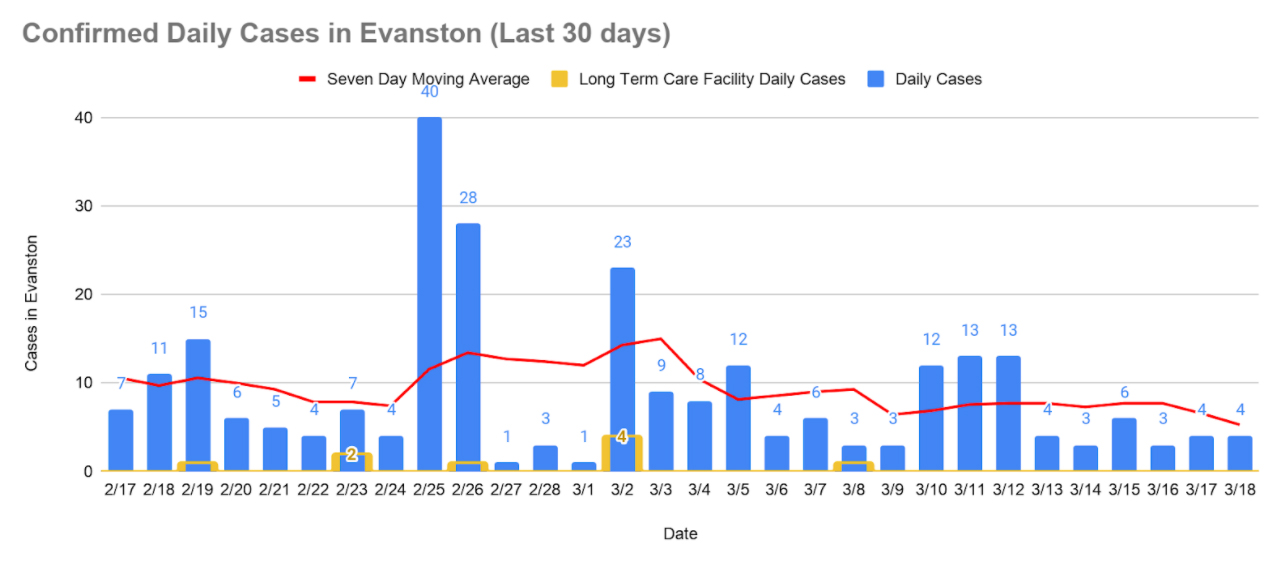 As of March 17, the seven-day rate of new cases per 100,000 residents remained steady in Evanston (73.50), Skokie (102.07), Chicago (74.43), Cook County (83) and Illinois (87.25).