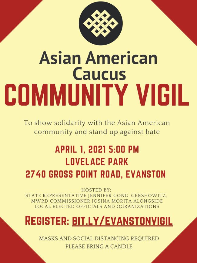Join Representative Jennifer Gong-Gershowitz, MWRD Commissioner Josina Morita, local elected officials and organizations for a Community Vigil to show solidarity with the Asian American community and stand up against hate in all forms. This event will take place at Lovelace Park this Thursday, April 1, at 5 p.m.