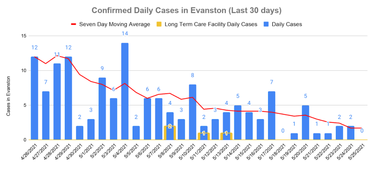 As of May 24, the seven-day rate of new cases per 100,000 residents decreased in Evanston (16.33), Skokie (90.91), Chicago (64.81) and Illinois (63.5). The City’s seven-day moving average positivity rate is 0.25 percent, compared to 0.65 percent one week ago.