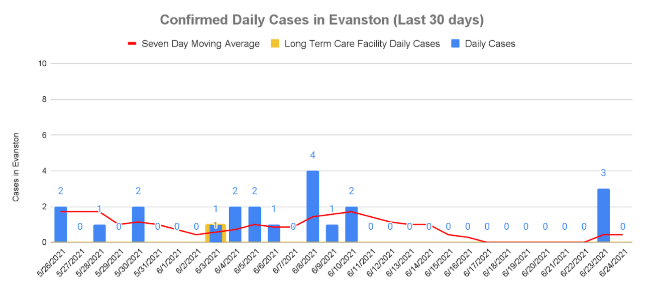 Evanston reported one new confirmed COVID-19 case over the last seven days, compared to three for the week prior. The City’s seven-day moving average positivity rate is 0.06 percent.