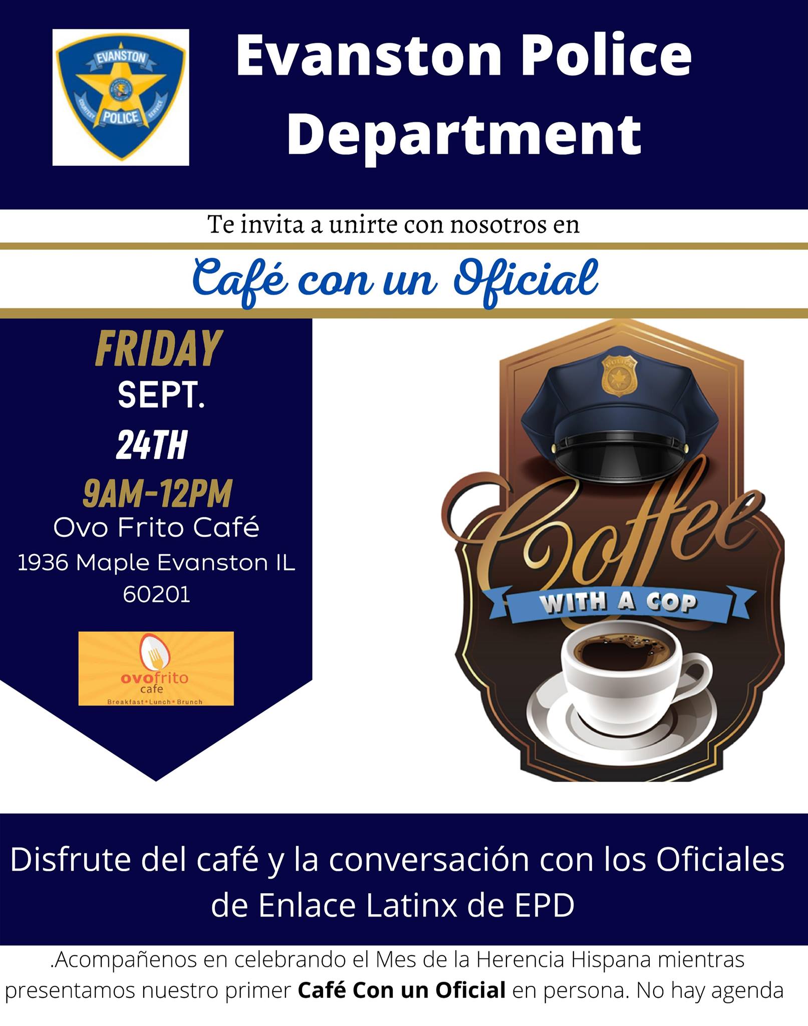 Coffee and conversation: Get to know the Evanston Police Department's Latinx Liaison Officers at “Café con un Oficial (.jpg)” on Fri., Sept. 24, 9 a.m. to noon, at Ovo Frito Café, 1936 Maple Ave.