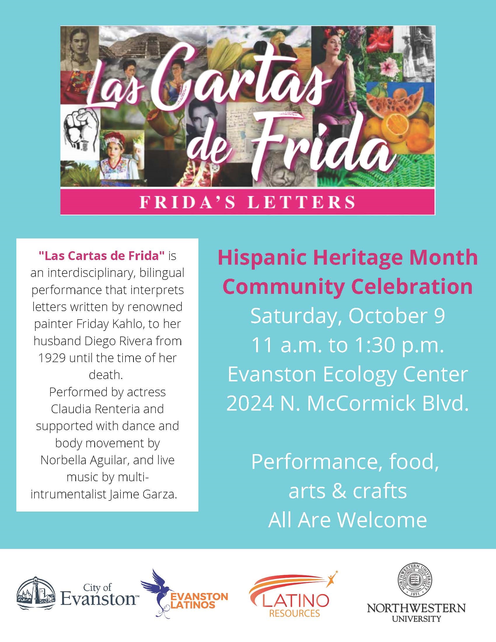Celebrate Hispanic Heritage Month: Sponsored by the City and Northwestern University, enjoy a Hispanic Heritage Month Community Celebration on Sat., Oct. 9, from 11 a.m. to 1:30 p.m. at the Evanston Ecology Center. There will be food, music, and arts and crafts by Las Cartas De Frida!