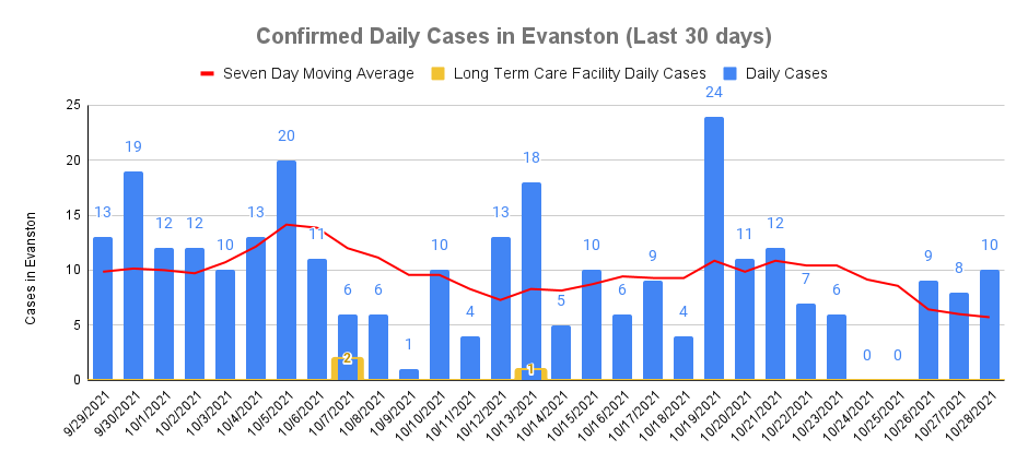 Cases: Evanston reported 40 new confirmed COVID-19 cases over the last seven days, compared to 76 for the week prior. To date, the city has had 5,476 total confirmed cases, and 122 residents have died of illness or complications related to COVID-19.
