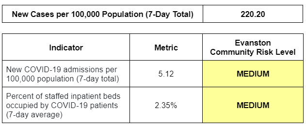 To date, Evanston has had 15,649 total confirmed cases, and 155 residents have died of illness or complications related to COVID-19. View the City’s interactive COVID-19 dashboard (view on mobile).