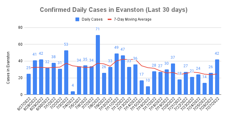 Evanston reported 172 new confirmed COVID-19 cases over the last seven days, compared to 186 for the week prior. The current seven-day moving average of daily confirmed cases is 24.57.