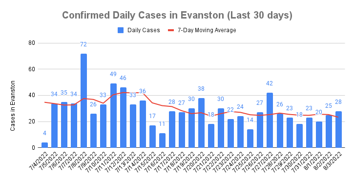 Cases: Evanston reported 163 new confirmed COVID-19 cases over the last seven days, compared to 172 for the week prior. The current seven-day moving average of daily confirmed cases is 23.29.
