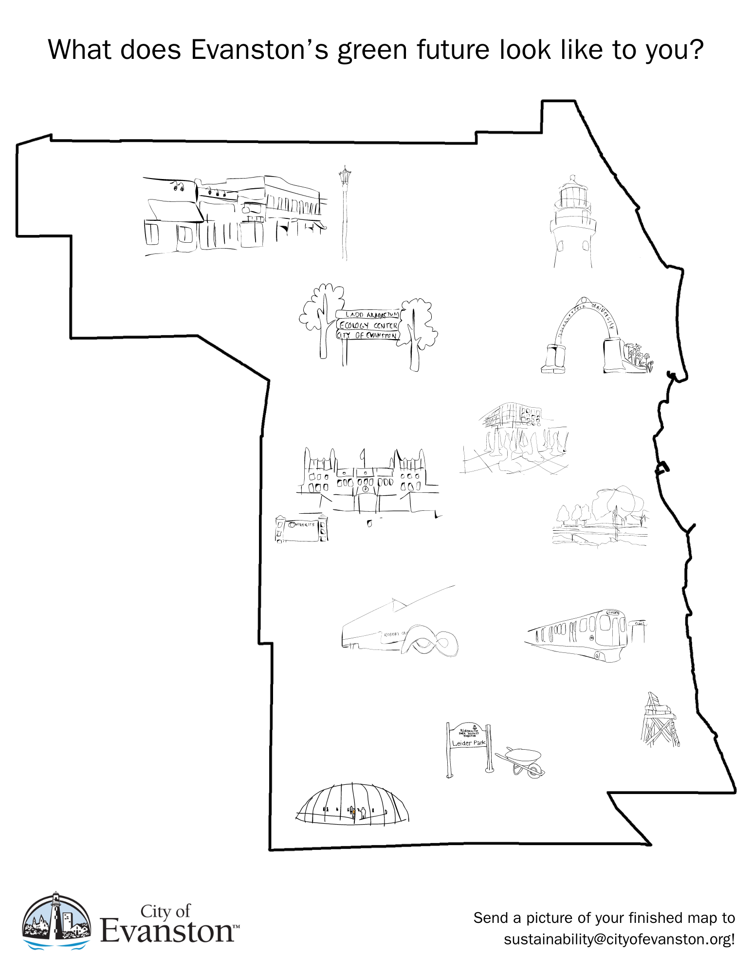 Calling youth artists! Use this map of Evanston as a guide and draw in what a sustainable future looks like to you. Turn in your submission to the security desk at the Civic Center or email a digital copy to sustainability@cityofevanston.org. A few lucky artists’ maps will be featured!
