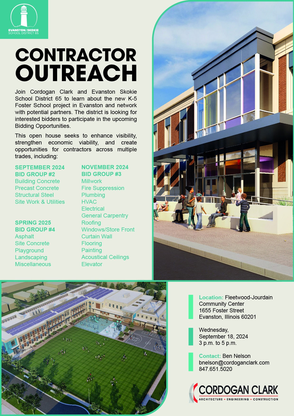 Contractor opportunities: Join Cordogan Clark and District 65 for an Open House on the new K-5 Foster School project in Evanston. Meet potential partners and explore upcoming bidding opportunities. Attend on Wed., Sept. 18, from 3 p.m. to 5 p.m. at the Fleetwood-Jourdain Center.