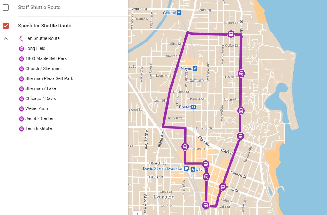 Northwestern University’s operation shuttle bus service is available from the 1800 Maple and 821 Davis self-park garages. The shuttle will be in effect to facilitate transportation.