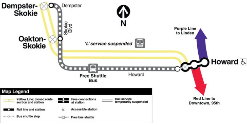 The CTA will close the Yellow Line for track maintenance from Sat., Nov. 9, to Sun., Nov. 10. Shuttle buses will replace train service between Dempster and Howard, with stops near the Oakton station, running every 15 minutes from 6 a.m. to 11:30 p.m. each day. Please allow extra travel time.