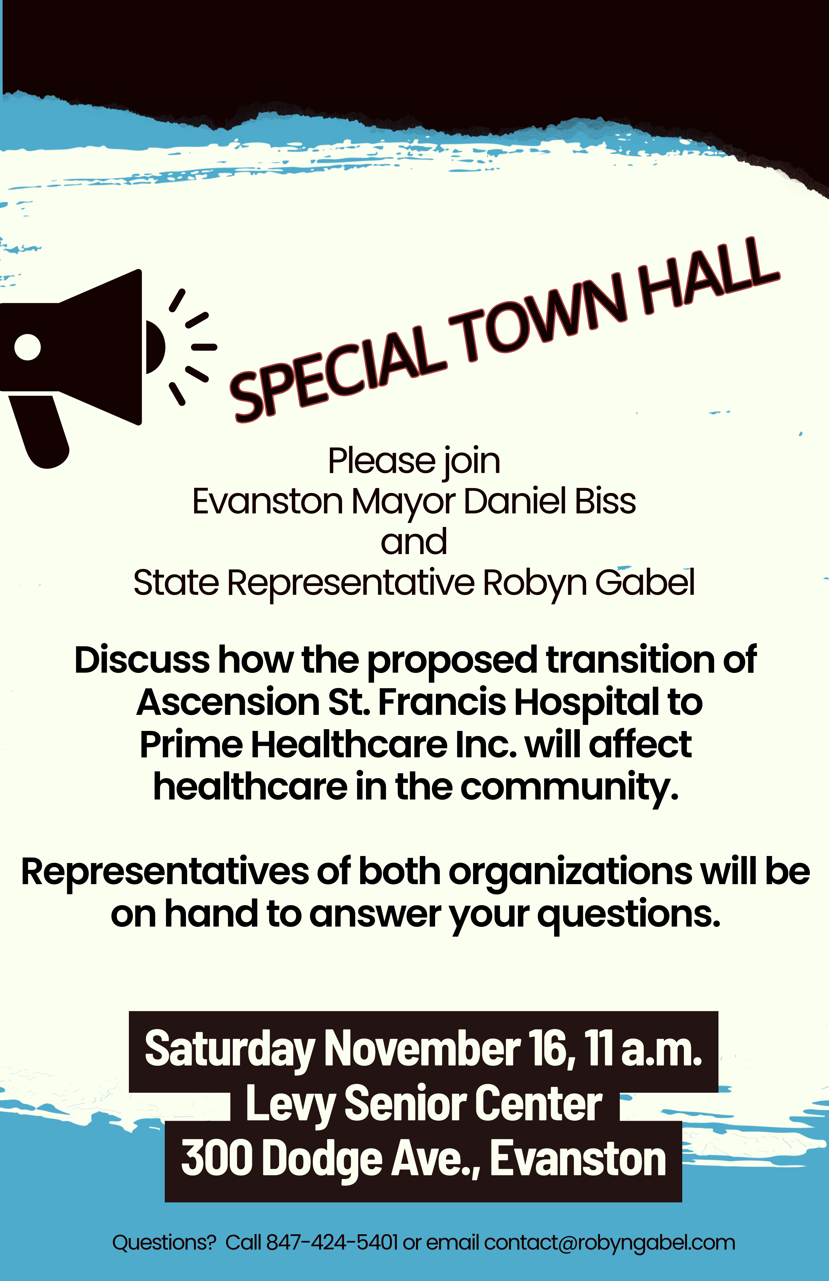 Join Mayor Biss and State Rep. Robyn Gabel for a special town hall to discuss how the proposed transition of Ascension St. Francis Hospital to Prime Healthcare Inc. will affect healthcare in the community. The event will take place on Sat., Nov. 16, at 11 a.m., at the Levy Senior Center.