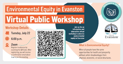 Couldn't make the in-person workshop? Join the Environmental Equity team for a virtual public workshop on Tues., July 22, at 6 p.m. The workshop will include a brief update on key findings from the team and interactive activities to explore strategies for advancing environmental equity in Evanston. Register to attend.