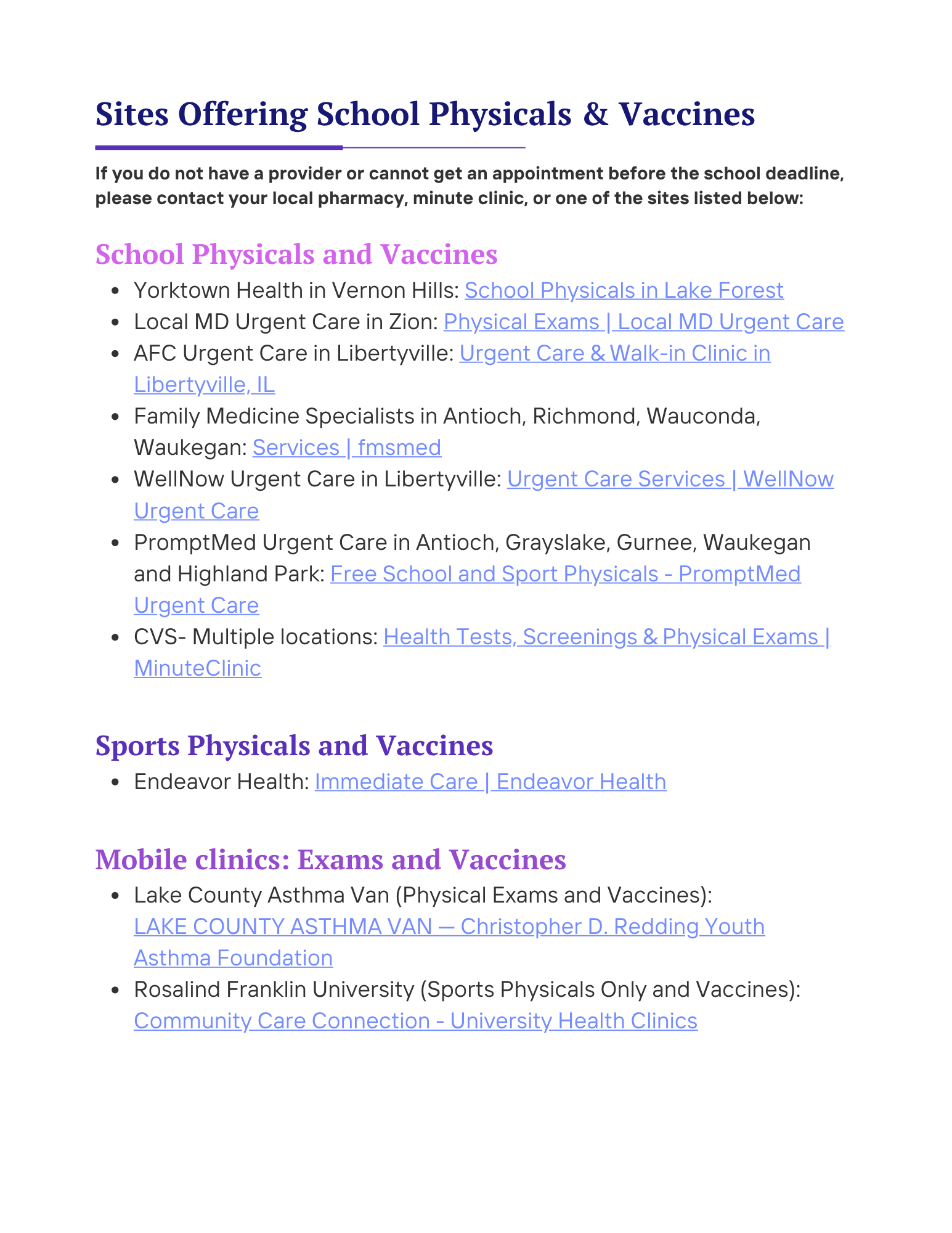 Contact your healthcare provider or local healthcare site to get your child's healthcare records updated. If you do not have a provider or cannot get an appointment before the school deadline, please contact your local pharmacy, minute clinic, or one of these listed sites.