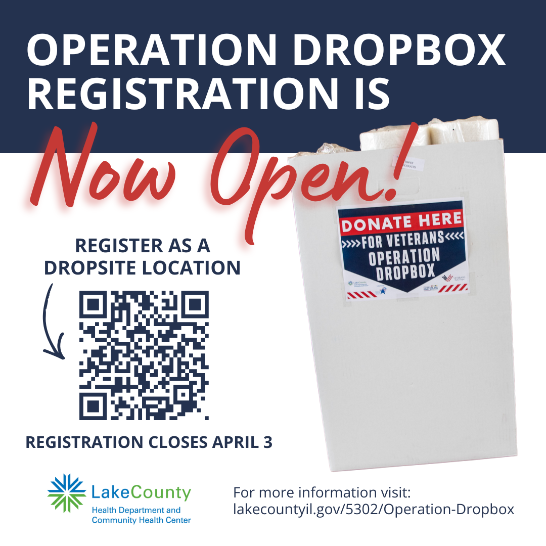 The Health Department is excited to announce its 2nd annual Operation Dropbox, a donation drive dedicated to supporting more than 3,000 local veterans and their families, in collaboration with the McHenry County Department of Health. Organizations, churches, libraries, and businesses in both Lake and McHenry counties are invited to participate as drop site locations for this important initiative.