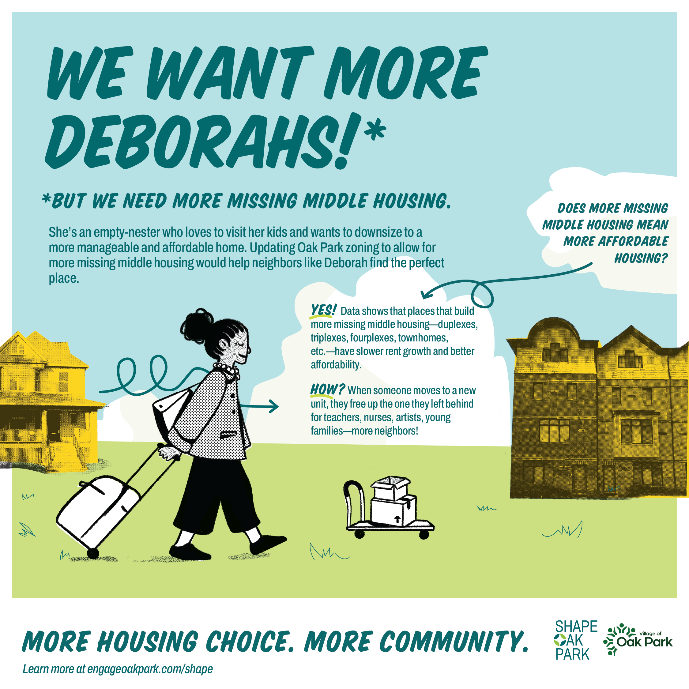 Shape Oak Park is a new Village initiative focused on making room for neighbors at every age and stage of life. Empty nesters, young teachers, nurses, artists, growing families — they all need different housing options. And when Deborah moves into a smaller home that fits her life now, she opens up her previous home for a family that needs the space. That's how missing middle housing works: It creates a healthier housing ecosystem for everyone. Data shows that communities with more diverse housing types have slower rent growth and better affordability. Join the conversation by at www.engageoakpark.com/shape. The page includes a survey, a section where community members can submit questions and more details about the initiative. Also, be on the lookout for more ways to share your voice at upcoming pop-ups and workshops over the next few months.