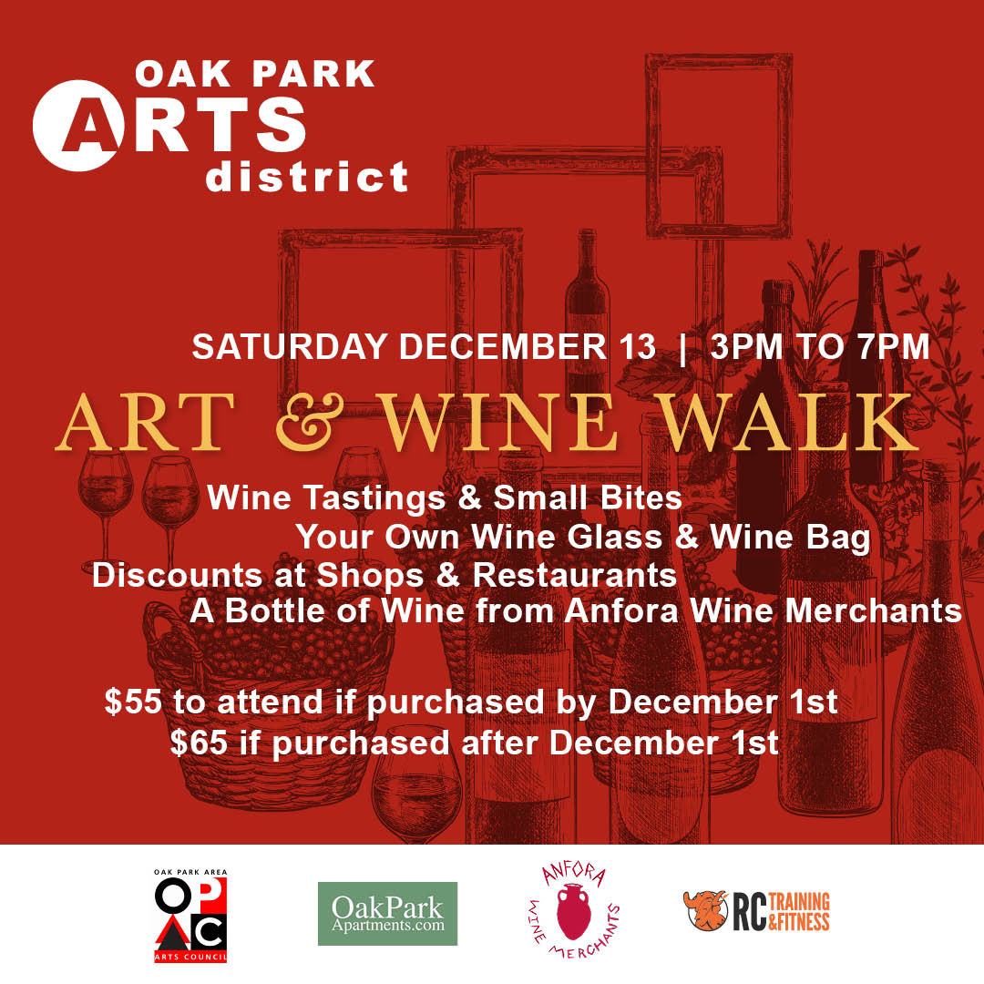 The Art & Wine Walk is happening this Saturday, Dec. 13 on Harrison Street in the Oak Park Arts District. Guests follow a tour of the Arts District stopping at 18 locations for wine tasting and small bites. A limited number of tickets are still available – click here for more information. And click here to watch a promotional video for the event produced recently by Media Production Manager Joe Kreml.