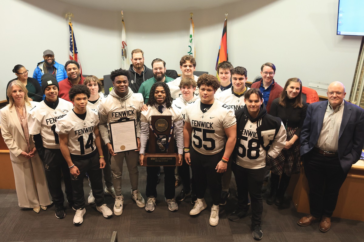 The Village Board celebrated the Fenwick football team’s Class 6A state championship by reading a proclamation honoring the Friars at this week’s Village Board meeting. Fenwick defeated highly touted East St. Louis 38-28 earlier this month to claim its second state championship in five seasons.