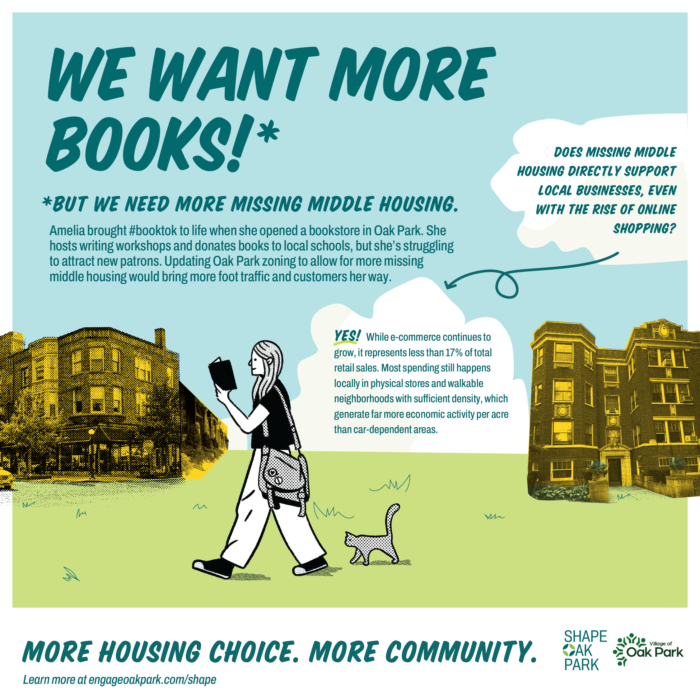 Shape Oak Park is a zoning code update that invites residents to guide Oak Park's evolution while creating more housing choices, which in turn can help boost small businesses. Missing middle housing brings more neighbors (and their wallets) to places like Amelia's bookstore. More housing options creates more vibrant, economically healthy communities. Through year-long engagement, residents will explore how missing middle housing (duplexes, townhomes and small-scale buildings) can expand opportunities for all to live here, all while preserving the neighborhood character that makes Oak Park special. Learn more about the project and share your input at www.engageoakpark.com/shape. Responses to the current Shape Oak Park online survey will be accepted through Jan. 16.