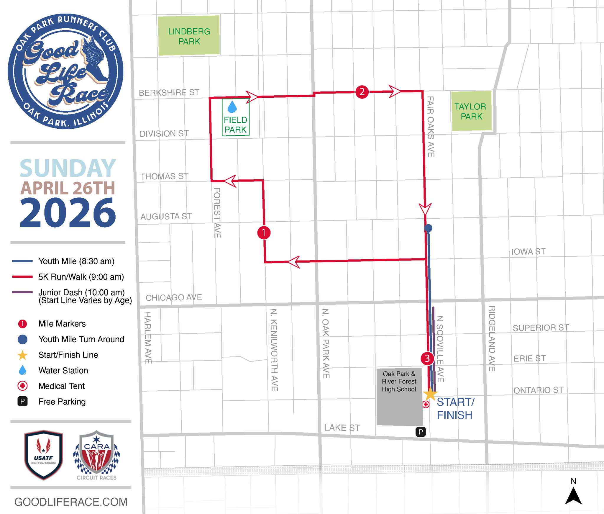 The annual Good Life Race will bring street closures along the 5K run/walk route in north central Oak Park from about 8 to 11 a.m. this Sunday, April 26. Several streets will be closed and traffic flow on others will be restricted. Drivers should expect they will not be able to cross the race course during the event. Please observe all no parking signs and give yourself extra time to maneuver around the race course. Click here to view the race route.