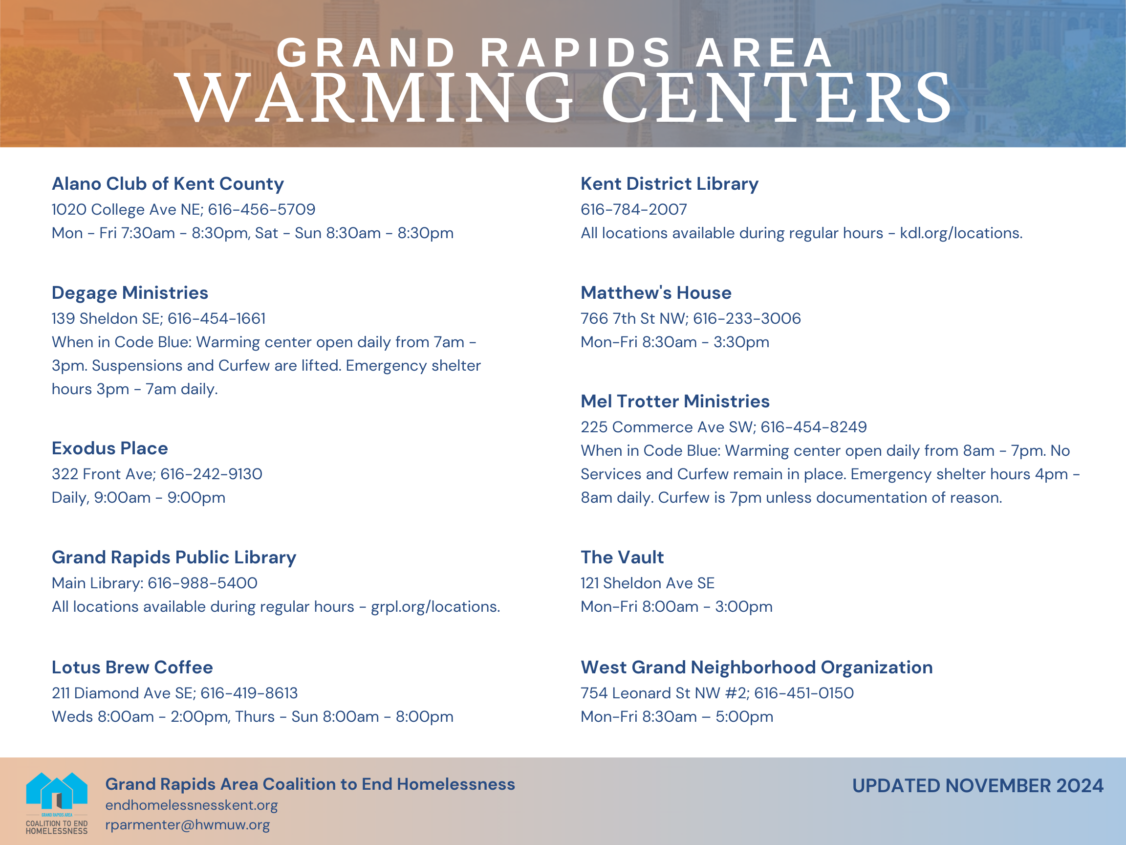 The list of warming centers in Grand Rapids has been updated and is available now for distribution! Please share widely! Click on the Image to view and download!