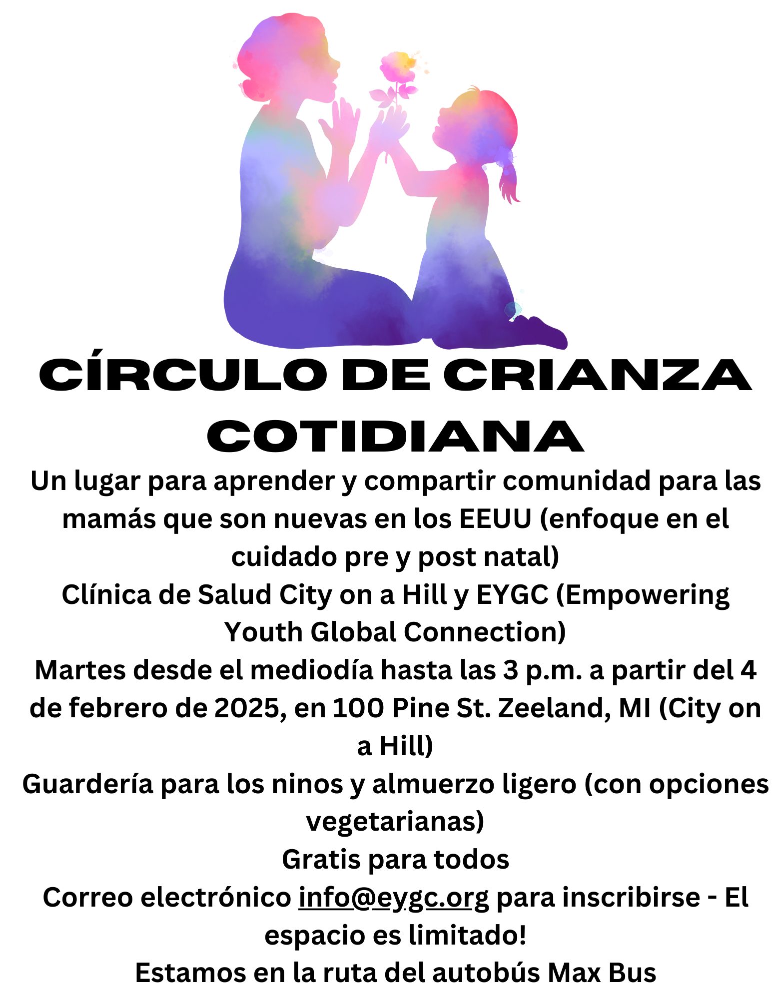 EYGC (Empowering Youth Global Connection), in partnership with City on a Hill Health Clinic and GVSU nursing students, is hosting free parenting classes for New American Moms. These classes are open to mothers with children of any age, with a special focus on expecting moms and those with infants.