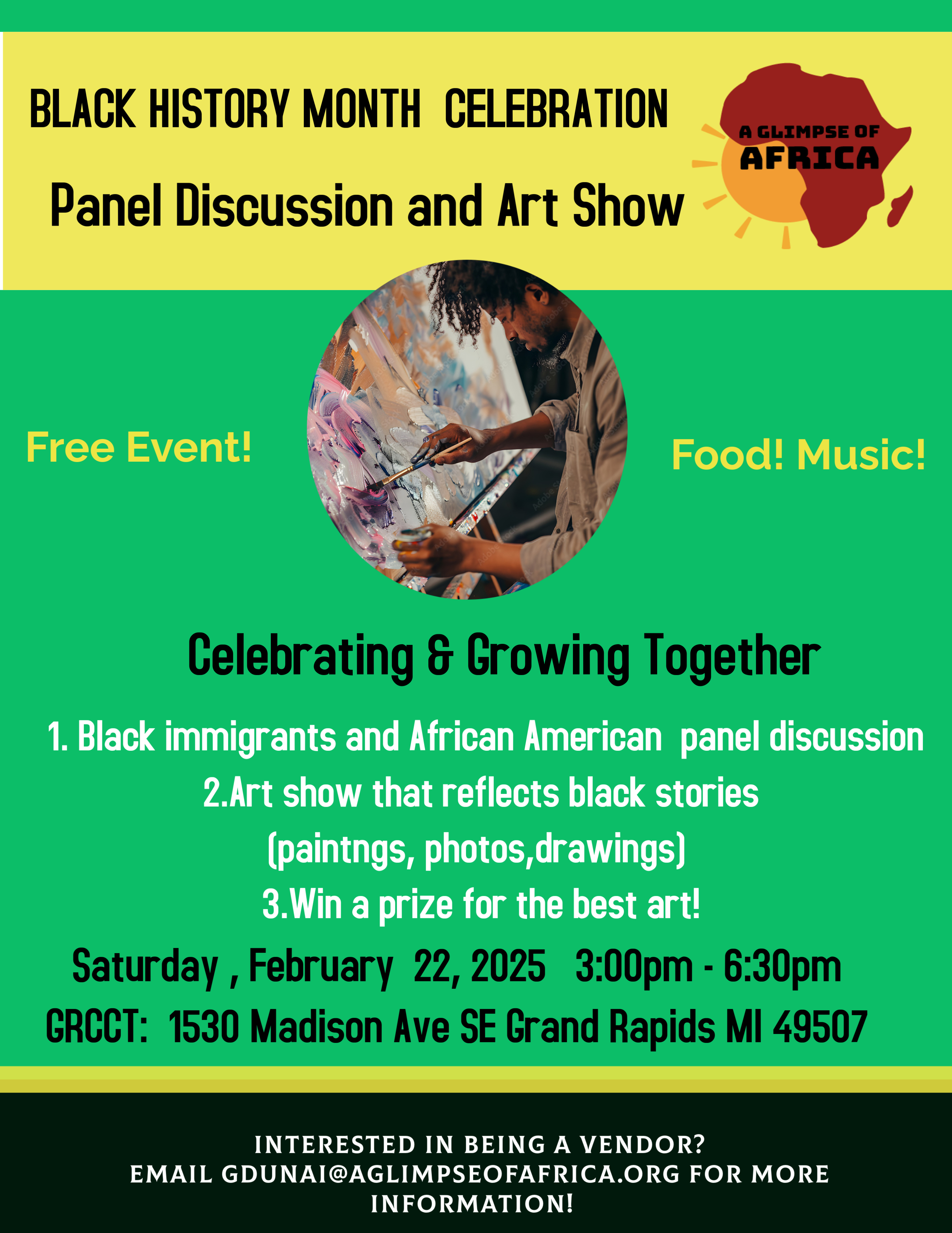 Free event featuring food, music, and vibrant discussions! Highlights include a panel on Black immigrants and African Americans, an art show showcasing paintings, photos, and drawings that reflect Black stories, and a chance to win a prize for the best art.