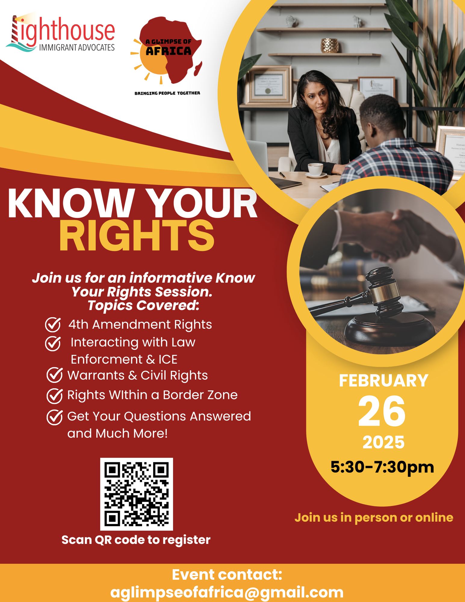 Due to high demand, A Glimpse of Africa, in partnership with Lighthouse Immigrant Advocates and attorney Bill, is offering another Know Your Rights Session. This session will cover important topics such as 4th Amendment rights, interacting with law enforcement and ICE, understanding warrants, and preparing for potential detention or deportation.