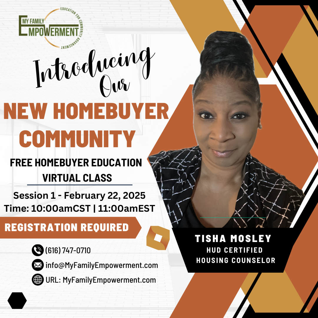 Join My Family Empowerment for a free, informative virtual class on homebuying, presented by Tisha Mosley, a HUD Certified Housing Counselor. Learn valuable tips, resources, and expert advice to help you navigate the homebuying process with confidence. Don't miss out on this opportunity to take the first step toward owning your home!