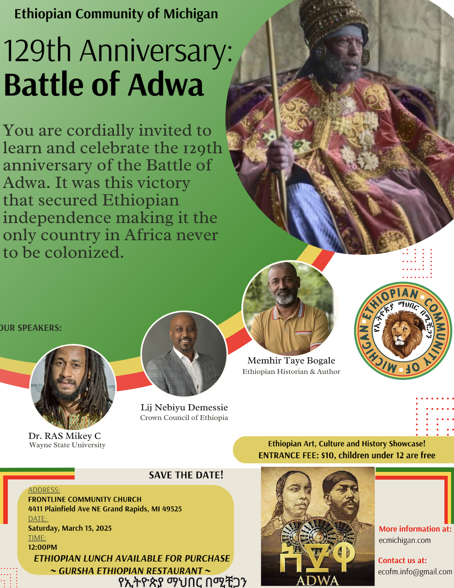 The Ethiopian Community of Michigan invites everyone to join in celebrating the 129th anniversary of the historic Battle of Adwa, a victory that secured Ethiopia’s independence and made it the only African country never to be colonized.